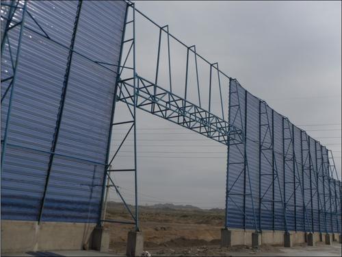 煤场因为煤料含有必定的硫分和蒸发分,是一个酸性环境,腐蚀性较强,选用玻璃钢防风抑尘网板,其缺陷是易被无机酸腐蚀,故不适于用在煤场等酸性环境中,且紫外线强度高的区域会加速其老化进程。而选用钢质防风抑尘网板,其明显特点是具有优异的耐腐蚀性和耐湿热性,但考虑到造价要素,规划使用年限较短的堆场挡风网也可选用玻璃钢质料网板。